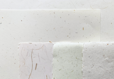 | お値段 | 菊判タテ目(636mm×939mm)の大きさの紙、厚さ約180g/㎡を機械漉きに て1,000枚のご注文の場合、単価は一枚あたりおよそ3,500円です。 ※異素材の粉砕加工料金は案件ごとに別途お見積させていただきます。 |